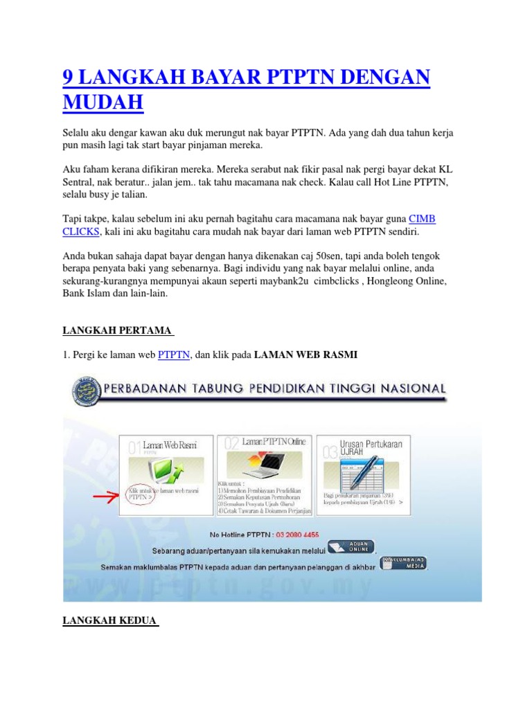 Berikut adalah cara dapatkan penyata maybank secara online melalui laman web maybank2u. Cara bayar ptptn melalui maybank2u mp3 & mp4. Untuk nasabah perusahaan (corporate) atau nasabah perorangan yang tidak memiliki kartu maybank atm atau maybank kartu kredit, pendaftaran maybank2u dapat dilakukan di kantor cabang maybank. Anda boleh semak melalui website air kelantan. Cara bayar ptptn melalui cimbclicks.